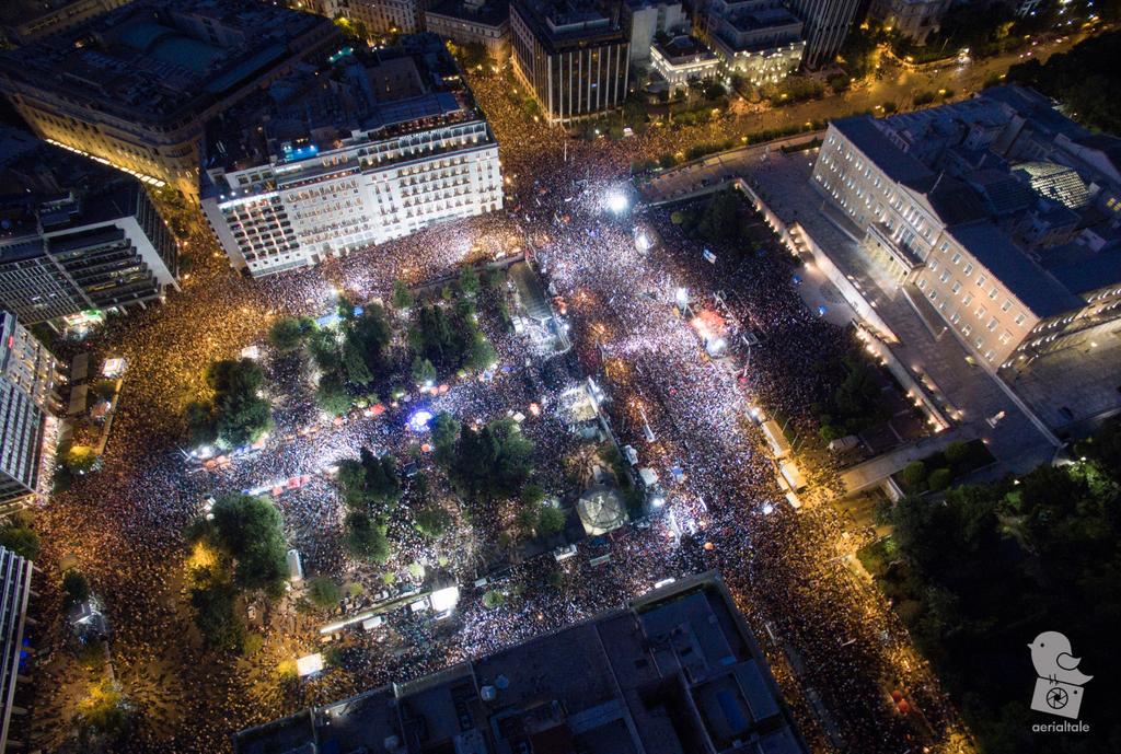 Citoyens d’Athènes, hommes et femmes de tous âges qui vous trouvez ici, aujourd’hui, qui submergez la Place de la Constitution, les rues d’Athènes et des autres grandes villes en bravant la montée de la peur orchestrée, la rhétorique de la terreur propagée tous ces derniers jours,
